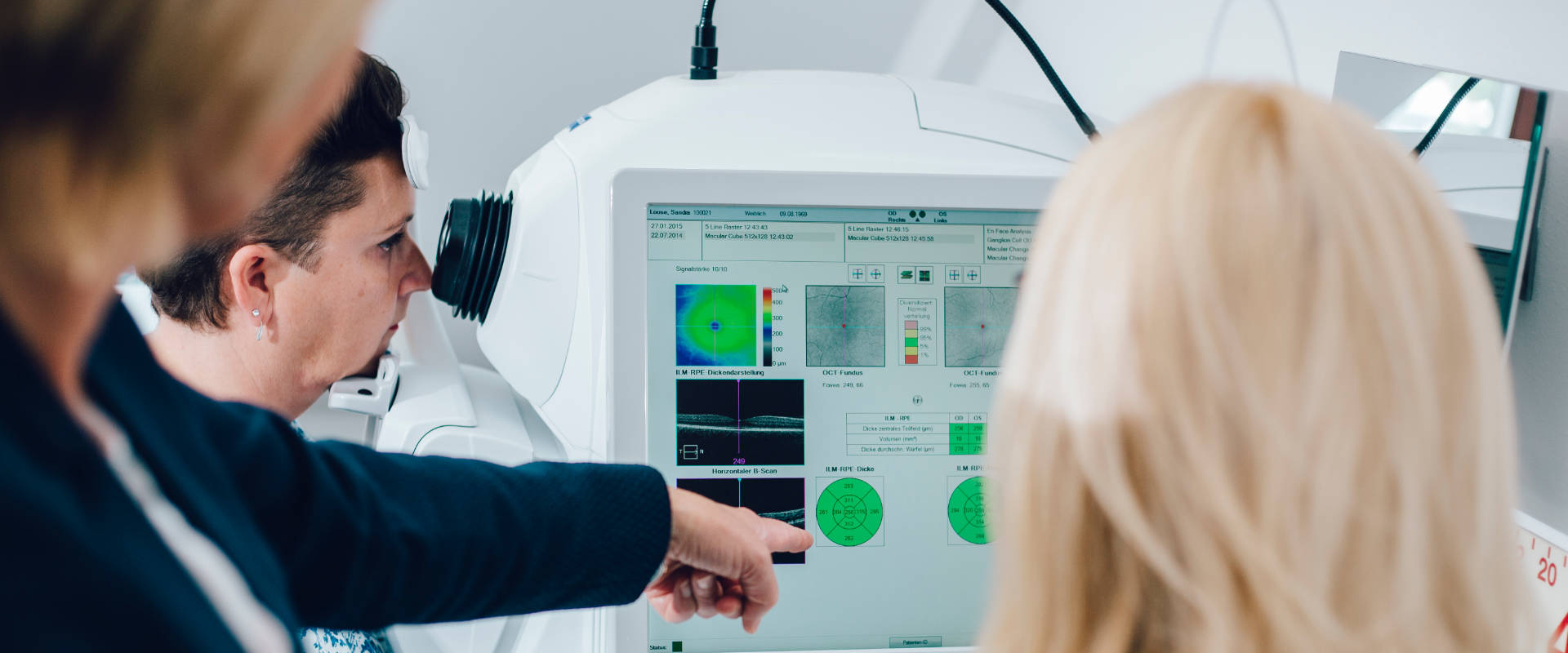 Die Makula ist die Stelle des schärfsten Sehens. Die altersbedingte Makuladegeneration (AMD) ist eine der häufigsten Ursachen für einen erheblichen Verlust des zentralen Sehvermögens. Grund hierfür sind Ablagerungen unterhalb der Netzhaut. Die altersbedingte Makuladegeneration wird in der Frühphase der Erkrankung vom Betroffenen nicht bemerkt. Erste subjektiv spürbare Anzeichen zeigen sich erst im fortgeschrittenen Stadium der Erkrankung: Beim Lesen werden das Fehlen von Buchstaben bemerkt oder Buchstaben werden sehr verschwommen wahrgenommen. Gerade Linien scheinen verbogen und verzerrt zu sein. Später taucht in der Mitte des Sehfeldes ein dunkler Fleck auf, der sich mit der Zeit immer weiter vergrößert. Bis vor wenigen Jahren galt die Erkrankung als unheilbar. Heutzutage existieren wirksame Therapiemöglichkeiten, auch schon in der Frühphase. Durch Analyse der einzelnen Netzhautschichten und deren Dicken im Bereich der Makula kann der aktuelle Zustand bestimmt werden. Frühformen von Makulaerkrankungen können mit neuen diagnostischen Methoden frühzeitig erkannt und anschließend behandelt werden. Wird beispielsweise die besonders gefährliche sogenannte feuchte AMD rechtzeitig erkannt, kann eine medikamentenbasierte Therapie eine Sehverschlechterung lange verhindern.